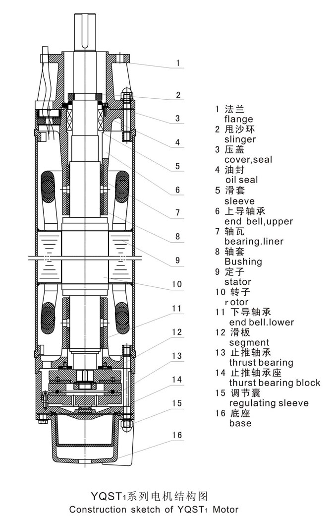 概述 YQST系列大容量潛水三相異步電動(dòng)機(jī)是應(yīng)國際市場(chǎng)需要,在小井徑中發(fā)展大容量電機(jī)而專門開發(fā)的一種新型潛水電機(jī),他特別適用于高揚(yáng)程潛水泵配套提取地下水,為城市工礦企業(yè)、農(nóng)業(yè)灌溉及居民生活提供生產(chǎn)和生活用水。本產(chǎn)品除具備一般井用潛水電機(jī)特點(diǎn)外,還具有單機(jī)容量大,力能指標(biāo)高,承受軸向力大,密封性能好等特點(diǎn)。為了適應(yīng)用花需要,電機(jī)機(jī)殼可采用不銹鋼材料,但需在合同中注明。 型號(hào)說明
