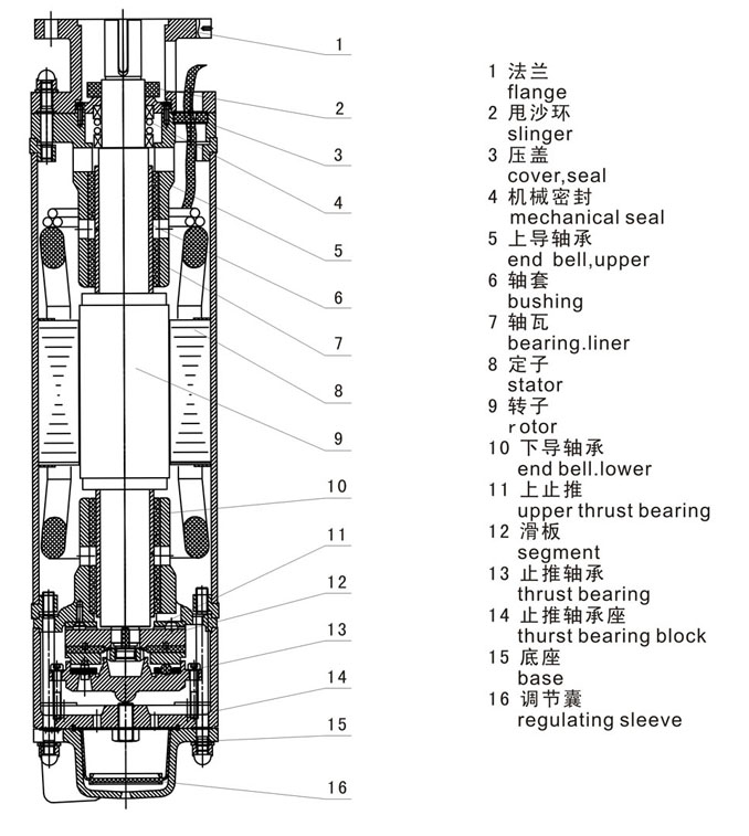 注:高推力型軸承需特殊訂貨,采用高推力型軸承的電機性能由用戶與制造廠協(xié)議。適用條件 1、電動機應完全潛入水中立式(或臥式適用),其潛入深度不大于70m,但不小于20m,最底位置距井底不少于5m(臥式使用時水位應高于潛水電機1m以上)。 2、介質水溫不高于20℃。 3、水中固體雜質含量(重量比)不超過0.01%。 4、水中氯離子含量不得超過400mg/L; 5、水中硫化氫含量不得大于1.5mg/L; 6、介質水中不含腐蝕性物質,PH值在6.5-8.5范圍內。 7、電機運行時內部應充滿潔凈的清水(可加防凍液)。 設備特點 ★ 電機防護等級:IPX8,絕緣等級為F; ★ 充水式潛水電動機結構簡單,定轉子繞組和鐵心直接浸在水中,冷卻效果好、輸出功率大、效率較高。 ★ 由于充水式潛水電動機內腔所充多為清水,使用過程中產生的滲漏對所安裝使用井水水質不會產生污染。 ★ 充水式潛水電動機的定子繞組。鐵心很軸承均在水中工作,對定子繞組所使用上網導線及其加工工藝、接頭材料及包扎工藝、水潤滑軸承的結構、材料及加工工藝、鐵心與金屬材料的防銹防腐蝕處理等有很高的要求。 電動機結構 1、 潛水電機由定子、轉子、上下導軸承、下連接法蘭、底座、軸伸密封裝置等組成。 2、 潛水電機各止口連接處采用密封圈密封;軸伸密封根據水質含砂量多少,選擇不同方式的密封裝置。(含砂量大于0.01%時采用橡膠骨架油封;含砂量大于0.01-0.5%時采用機械密封) 3、 電動機下部裝有橡膠調節(jié)囊,其作用為當電機內部熱脹冷縮時及電機外部水位高低變化時,用以平衡電機內腔與水的壓力。 4、 電動機定子繞組采用耐水絕緣線,有良好的絕緣能力,繞組線與耐水JHS型電纜連接。 5、 潛水電機上、下導軸承座內裝有軸瓦,轉子下部裝有止推軸承。止推軸承由上、下止推軸承及滑板組成,用于承擔軸向力。 技術支持 1、保證電機的引出電纜處端電壓為380(1±5%)V,頻率為50(1±1%)HZ(其它電壓或頻率須特殊訂貨)。 2、電機的******運行電流不得大于銘牌上的標定值(即額定電流,配套廠家和用戶在選用和調試潛水電泵機組的電源控制設備時,應特別注意); 3、電機應選用合適的控制方式(可實現電機的過載、欠壓、斷相運行的保護并可根據水位自動控制電泵的起停); 4、電機為連續(xù)工作制(S1)。兩次起動時間間隔不得小于10分鐘; 5、電機應可豎直使用,也可臥式使用(須特殊訂制); 6、用于水池或超過規(guī)定的井徑中時應加裝吸水罩,使電機表面的水流速度達到0.5-1m/s,以保證電機良好的散熱。吸水罩應將電動機和第一,二級泵包括在內。 供貨范圍 潛水電機主機(包括3米引纜),電纜的接頭絕緣粘帶(包括優(yōu)質聚氯乙烯粘帶、自熔乙丙膠帶、丁基橡膠自粘帶)使用維護說明書1份,合格證1份裝箱單1份,木箱包裝。 注:當環(huán)境水或電網電壓、頻率不符合上述規(guī)定時,用戶可以提出要求,本公司提供訂制適用產品。